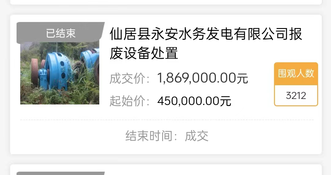 自統(tǒng)一全市國有資產(chǎn)公開交易平臺以來,11月20日,仙居首宗項目——仙居縣永安水務(wù)發(fā)電有限公司報廢設(shè)備處置成功高溢價成交。該項目起拍價45萬元,經(jīng)573輪次競價,最終成交價186.9萬元,溢價率高達315.33%,創(chuàng)下2023年以來新高。
